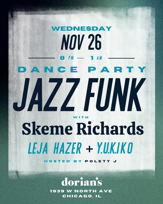 Next Wednesday night, Thanksgiving Eve I have the honor of returning to Chicago to play the Jazz Funk Dance Party at Dorian’s alongside Leja Hazer and Y.U.KIKO. JFDP is an amazing night of heavy tunes and packed dance floor that’s very unique and special in every way. Looking forward to joining in for the night and being in the booth with these two amazing DJ’s and collectors who have really done something special for the city of Chicago.